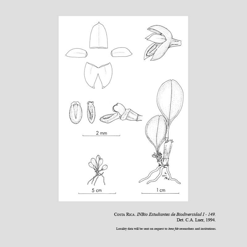 Found in the Guanacaste coast of Costa Rica in primary forests at elevations around 600 meters as a miniature sized, hot to warm growing epiphyte with erect, short, ramicauls enveloped basally by 2 to 3 loose, ribbed, tubular sheaths and carrying a single, apical, erect, coriaceous, elliptical, rounded apically, gradually narrowing below into the cuneate petiolate base leaf that blooms in the summer on a congested, .08" [2 mm] long including the peduncle, simultaneously 2 to 3 flowered inflorescence arising laterally from the ramicaul and has thin floral bracts.