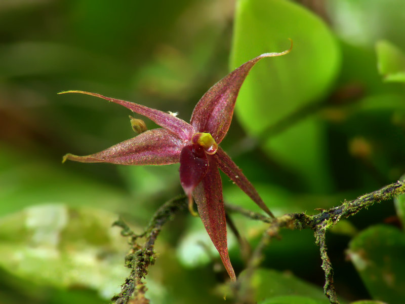 Found in Costa Rica at elevations around 1800 meters as a mini-miniature sized, cool growing epiphyte with erect, slender ramicauls enveloped basally by 2 to 3 thin, ribbed, imbricating sheaths and carrying a single, apical, erect, coriaceosu, narrowly elliptical-obovate, subacute, narrowly cuneate into the elongate, petiolate base leaf that blooms at any time of the year on a erect, slender, .88 to 1.28" [2.2 to 3.7 cm] long including the .4 to 1" [1 to 2.5 cm] long peduncle, loose, distichous, successively several flowered inflorescence arising laterally from the ramicaul and has thin floral bracts.