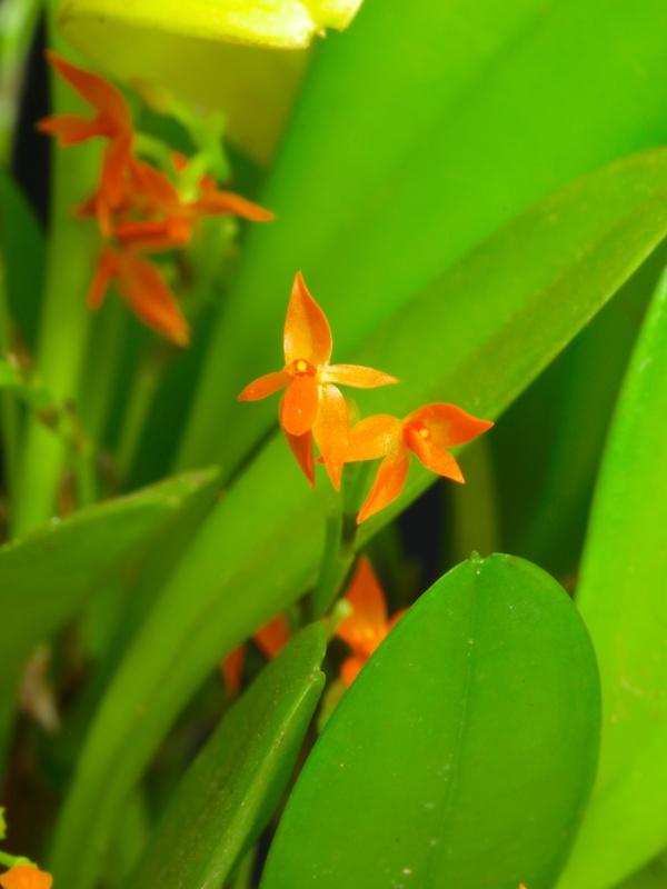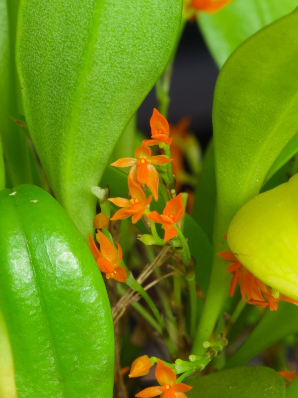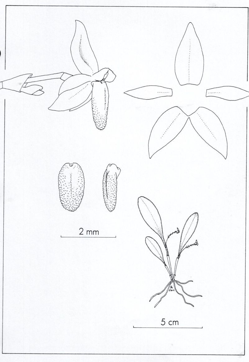 Found in Ecuador in cloud forest at elevations of 1300 to 1650 meters as a small sized, cool growing, caespitose epiphyte with an erect, stout ramicaul enveloped by 2 to 3 short, ribbrd imbricating sheaths with a single apical, erect, thickly coriaceous, epetiolate, narrowly ovoid, semiterete to fusiform, acute leaf that blooms on an erect, slender, .92 to 1" [2.3 to 2.5 cm] long incl, racemose, successively many flowered inflorescence with hyaline bracts and only one or two flowers at a time held at mid leaf length occuring in the spring.