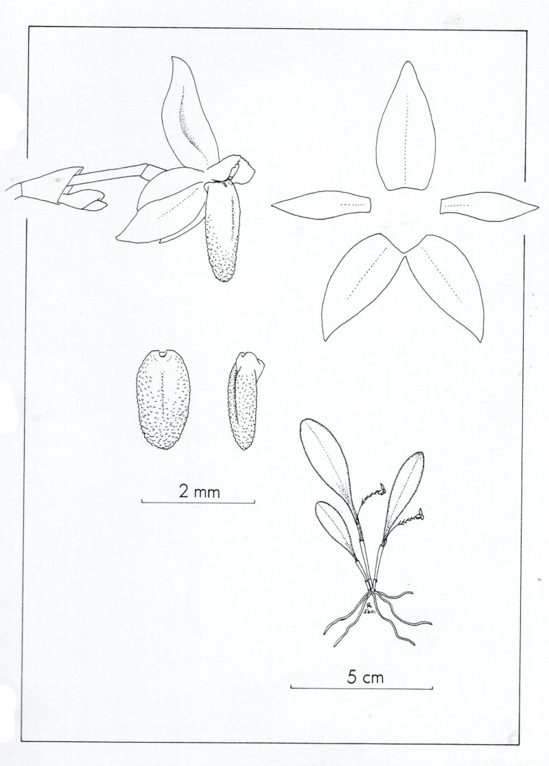 Found in Ecuador and Panama in wet cloud forests at elevations around 1000 to 1600 meters as a mini-miniature sized, cool growing epiphyte with erect, slender ramicauls enveloped by 2 to 3, thin, ribbed, imbricating sheaths and carrying a single, apical, erect, coriaceous, narrowly elliptical-obovate, subacute, narrowly cuneate below into the petiolate base leaf that blooms in the fall and winter on a filiform, erect, to 3.2" [8 cm] long including the filiform .4 to .8" [1 to 2 cm] long peduncle, distichous, distantly and successively several flowered inflorescence arising laterally from the ramicaul and has a thin floral bract.