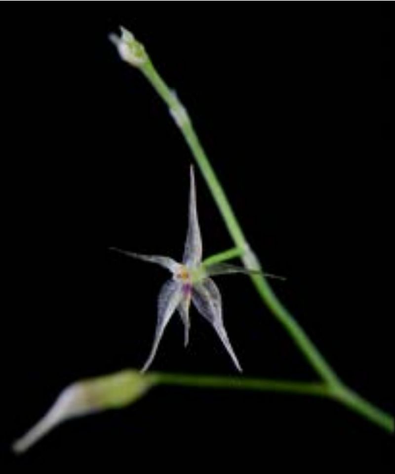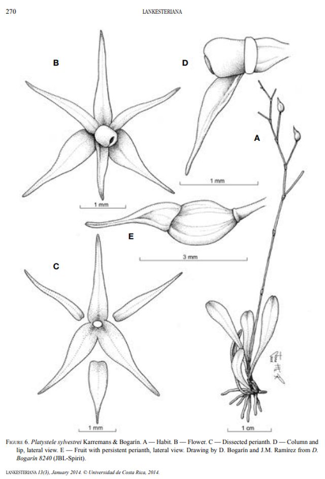"Platystele sylvestrei probably belongs to the P. oxyglossa species complex, however, it has a relatively large habit, reaching above 4" [10 cm] when including the inflorescence. The species can be easily recognized by the lax inflorescence, the long pedicels, the whitishtransparent, autogamous/cleistogamous flowers and the narrow, glabrous flower segments, with a narrowly ovate-lanceolate lip." Bogarin & Karremans 2014