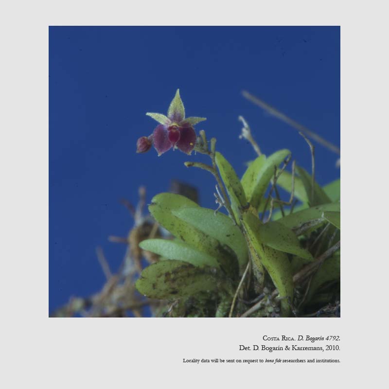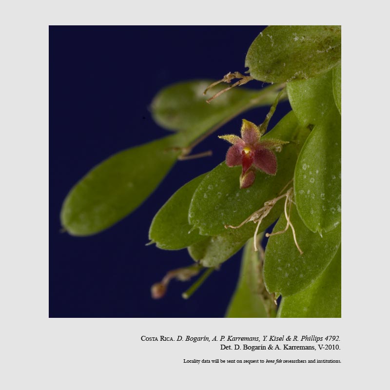 Found in Cartago province of Costa Rica at elevations around 1200 meters as mini-miniature sized, cool growing epiphyte with an erect, slender ramicaul enveloped by 2 to 3, thin, imbricating tubular sheaths and carrying a single, apical, erect, coriaceous, elliptical, conduplicate, subacute, conduplicate below into the petiolate base leaf that blooms in the spring on an erect, slightly congested, distichous, .6” [1.5 cm] long including the .28 to .4” [7 to 10 mm] long peduncle, successively few flowered inflorescence with acute, conduplicate floral bracts.