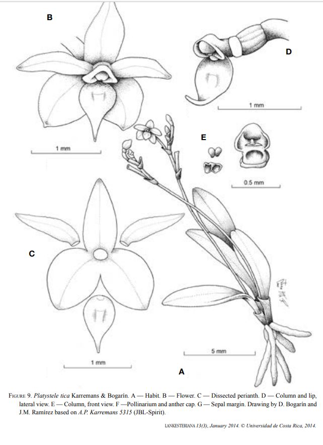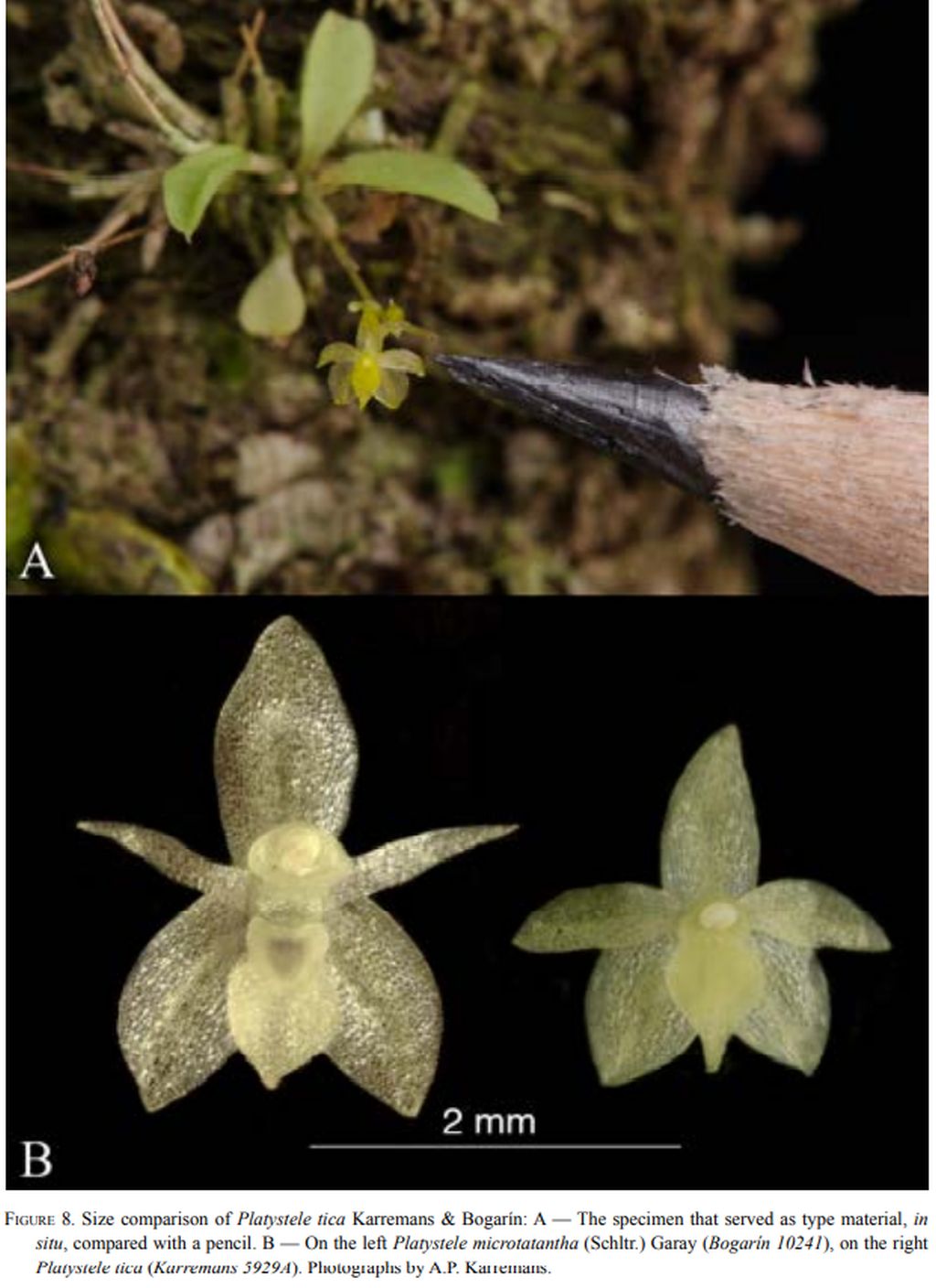 "Platystele tica is without obvious close relatives in Costa Rica. General plant morphology would suggest affinity with the P. oxyglossa group, as does the lip shape. The new species, however, lacks the typical caudate sepals and the reddish-purplish coloring of the lip. Flower coloration and size are somewhat reminiscent of Platystele minimiflora (Schltr.) Garay, however that species has a creeping habit. P. tica has one of the smallest flowers in the genus rivaled only by that of P. enervis Luer, P. ornata Garay and P. umbellata P.Ortiz. It makes the previous Costa Rican famous dwarfs, P. jungermannioides (Schltr.) Garay and P. microtatantha (Schltr.) Garay, look large. This species might not necessarily be rare, we have observed at least a couple of specimens more in the field and photographed by enthusiasts, but considering the minuscule size of the plant and flower, the lack of herbarium collections and habitat loss in the area it grows, it is not unsurprising that it had escaped description. ." Bogarin & Karremans 2014