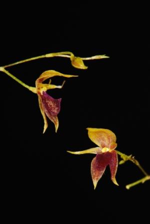 Found in Imbabura Ecuador at elevations around 1500 to 1700 meters as a mini-miniture sized, warm to cool growing epiphyte with erect, slender ramicauls enveloped by 2 to 3, ribbed sheaths and carrying a single, apical, erect, coriaceous, broadly elliptical, obtuse, cuneate below into the petiolate base leaf that blooms in the summer on a suberect, loose, distichous, to 1.6" [4 cm] long including the .8 to 1.2" [2 to 3 cm] long filiform peduncle, subflexuous, racemose, successively few flowered inflorescence arising from low on the ramicaul and has oblique floral bracts.