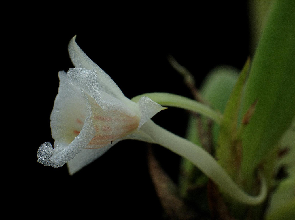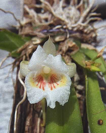 Found in Guatemala, Costa Rica, Panama, Colombia and Peru as a miniature, hot growing, epiphyte that is found in windy, premontane forests in deep shade at elevations of 330 to 1400 meters, with small, obscure, rounded to suborbicular pseudobulbs partially enveloped by imbricating sheaths arranged in a fan-shape which turn to paper with time, carrying a single apical, fleshy, elliptic-oblong, acute, abaxially carinate, basally conduplicate leaves that blooms in the summer on a 1 3/5" [4 cm] long, basal through the leaf axils, successively single flowered inflorescence subtended by short triangular bracts.