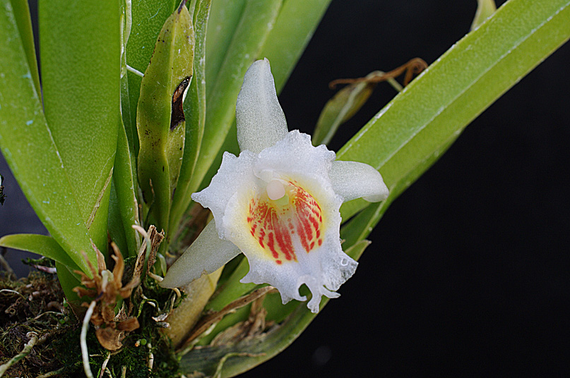 Found in southwestern Ecuador in El Oro state as a min-miniature sized, warm to cool growing epiphyte with oblong, flattened pseduobulbs enveloped by imbricating, conduplicate sheaths and carrying a single, ligulate-elliptic, acutre, narrowing below into the conduplicate, subpetiolate base leaf that blooms at most any time of the year on a basal, to 2" [5 cm] long,successively single, 2 to 4 flowered inflorescence with several tubular bracts.