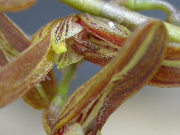 Found in southeastern Brazil as a miniature, warm to cool growing epiphyte with clustered stems carrying a single, apical, erect, leathery leaf and blooms from its base on an erect, to 12" [to 30 cm], slightly fractiflex, and has up to 12 widely spaced flowers ocurring in the spring and summer.