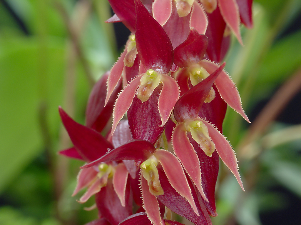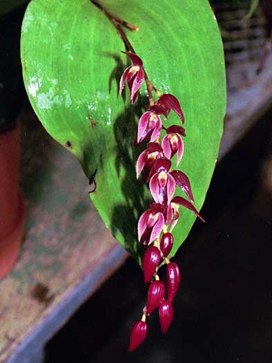 Found in the central cordillera of Colombia near Medellin as a small sized, cool to cold growing, epiphyte at elevations around 2000 meters with stout, erect ramicauls enveloped basally by 2 to 3 tubular sheaths with another below the middle carrying an erect, coriaceous, ovate, acute, lightly acuminate leaf with a sessile base and broadly cuneate that blooms in the spring in cultivation on a loose, distichous, 5.5 to 6" [14 to 20 cm] long, simultaneously opening, several flowered inflorescence subtended by a reclining spathe and having infundibular, thin floral bracts.