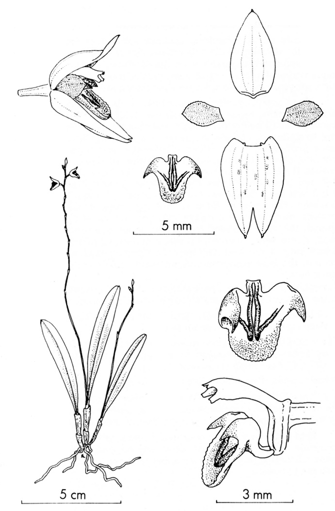 Found in southern Colombia at elevatios of 100 to 500 meters as a miniature sized, hot growing epiphyte with slender, erect ramicauls enveloped by 2 to 3 tubular sheaths and carrying a single, apcial, erect, coriaceous, narrowly obovate, subacute to obtuse, narrowly cuneate below into the conduplicate base leaf that blooms in the summer on an erect, subflexuous, 14" [35 cm] long, loose, distichous, successively many flowered, racemose inflorescence arising from near the apex of the ramicaul and has oblique, acute floral bracts.