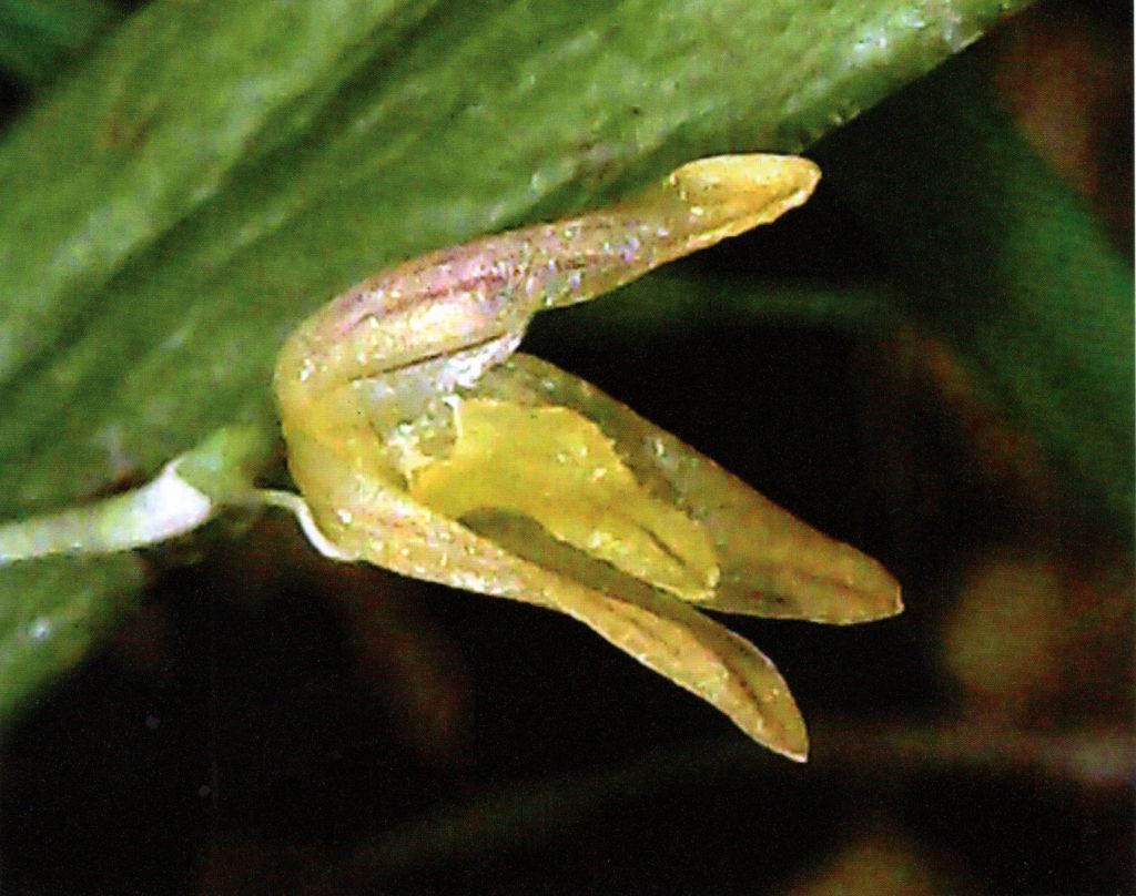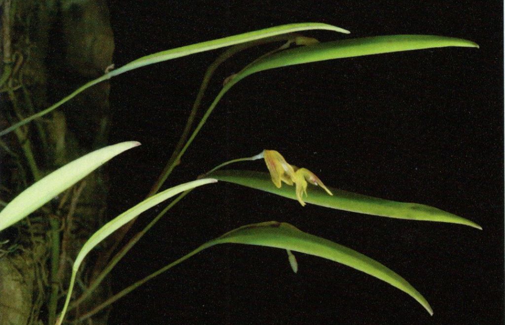 Found in Minas Gerais state of Brazil in riparian forests at elevations around 850 meters as a mini-miniature sized, warm growing epiphyte with a creeping, cylindrical rhizome giving rise to rigid, terete ramicauls enveloped in the lower 1/3 by ochre colored, deciduous sheaths and carrying a single, apical, erect, coriaceous, lanceolate, acute, retuse, gradually narrowing below into the base leaves that blooms in the summer on an erect, [1.2 cm] long, racemose, shorter than the leaf, peduncle green, .08" [2 mm] long, arising through a short, acute spathe, simultaneously 2 to 3 flowered inflorescence with off-white, triangular, short, acute floral bracts.