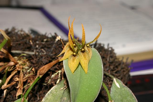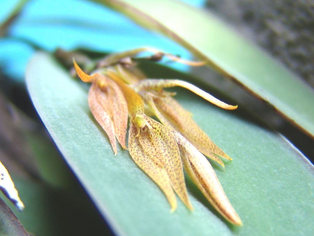 Found from Chiapas stae of Mexico, Belize and Guatemala on the gulf slope in wet montane rainforests and elfin forests at elevations of 800 to 1350 meters as a miniature to small sized, warm to cool growing epiphyte with slender, with 2 internodes, dilated and slightly compressed towards the apex ramicaule enveloped basally by tubular, funnel-shaped sheath and carrying a single, apical, arcuate to pendant, sessile, oblong-elliptic to lanceolate, acuminate apically, gradually narrows below into the elongate, petiolate base leaf that blooms in the fall on a fascile of simultaneous, 5 to 10 flowered inflorescence holding the distichous flowers close to the apex of the ramicaul.