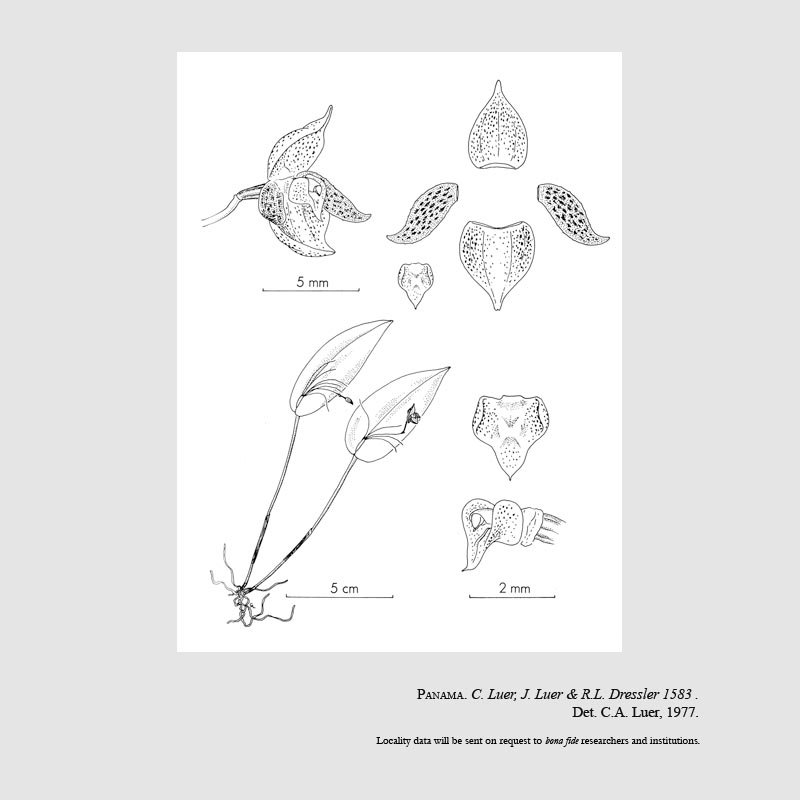 Found in Chiriqui Panama in cloud forests at elevations around 1700 meters as a mini-miniature to small sized cool growing epiphyte with erect, slender ramicauls enveloped by a thin, tubular sheath below the middle and 2 to 3 others above the base and carrying a single, apical, erect, thinly coriaceous, suberect, ovate, acute, rounded to shallowly cordate below into the sessile base leaf that blooms in the winter on a fascile of .6 to 1" [1.5 to 2.5 cm] long, single flowered inflorescence arising through a spathe at the base of the leaf.