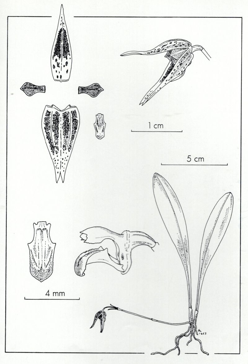 Found in Panama and Colombia in cloud forests at elevations of 750 to 1200 meters as a small sized, warm to cool growing epiphyte with short, slender, erect ramicauls enveloped by 2 thin, tubular sheaths and carrying a single apical, coriaceous, narrowly obovate, subacute gradually narrowing below into the indistinct petiolate base leaf that blooms in the summer on a congested fascile of more or less horizontal, 2 to 3.2” [5 to 8.5 cm] long, successively single flowered inflorescence with thin, tubular, imbricating floral bracts.