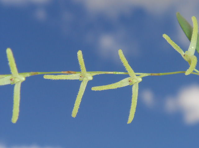 Found in Peru without collection data as a miniature sized epiphyte with erect, slender ramicauls with 2 to 3, blackish, tubular sheaths below the middle and at the base and carrying a single, apical, elliptical, obtuse to rounded, cuneate below into the petiolate base leaf that blooms on an erect, 2.4 to 2.8" [6 to 7 cm], loose, secund, simultaneoulsy opening several flowered, racmose inflorescence arising through a spathe with an annulus below the apex of the ramicaul.