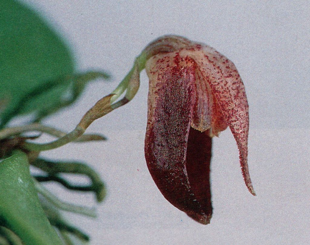 Found in Costa Rica, Colombia, Peru and Bolivia without elevational data as a mini-miniature sized, warm growing epiphyte with suberect, stout, ramicauls enveloped by 2 thin, tubular sheaths and carrying a single, apical, erect, coriaceous, broadly elliptical, obtuse, cuneate below into the petiolate base leaf that blooms in the winter, spring and summer on an erect to pendant, lax, subflexuous, .6 to 1" [1.5 to 2.5 cm] long, successively 2 to 6 flowered inflorescence arising laterally and has a thin, tubular floral bract.