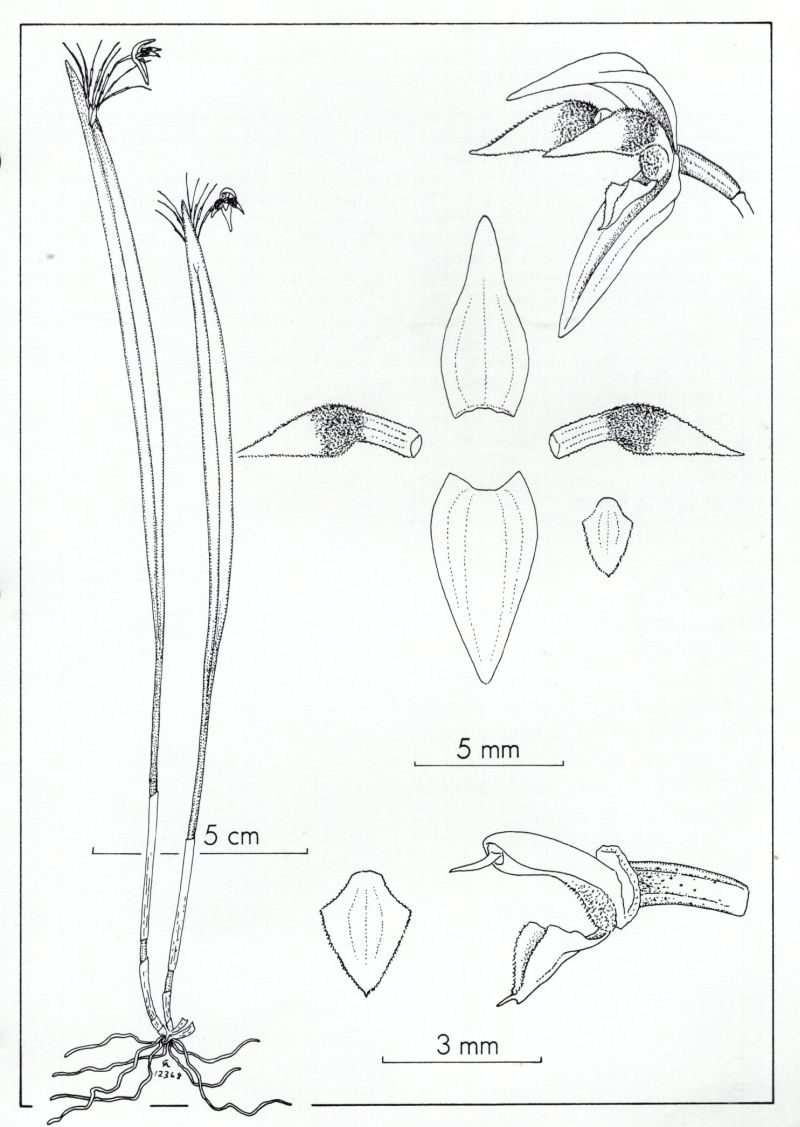Found in Colombia and Ecuador in cloud forests at elevations of 750 to 800 meters as a miniature sized, deciduous leafed, warm growing epiphyte with slender, erect, ramicauls enveloped basally by 2 to 3 tubular sheaths and carrying a single, apical, coriaceous, narrowly elliptical-linear, acute leaf with a narrowly cuneate base that blooms at any time of the year on a fascile of successively single flowered, 2/5" [1.2 cm] long inflorescence arising from a spathe.