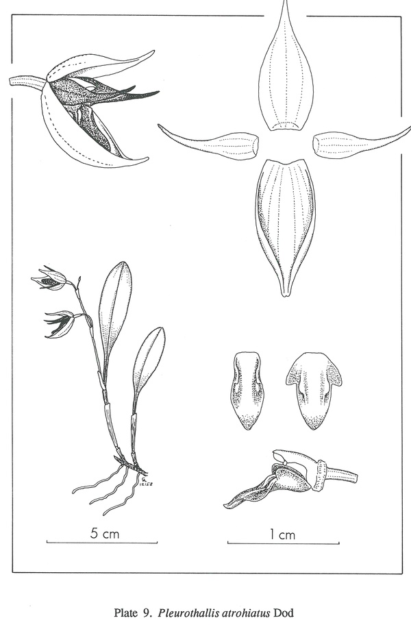 Pleurothallis atrohiata Dod 1989 SUBGENUS Elongatia Luer 1986 Drawing by Carl Luer and The Swiss Orchid Foundation at the Jany Renz Herbaria Website Common Name The Dark Opening Pleurothallis [Refers to the dark interior of the flower]