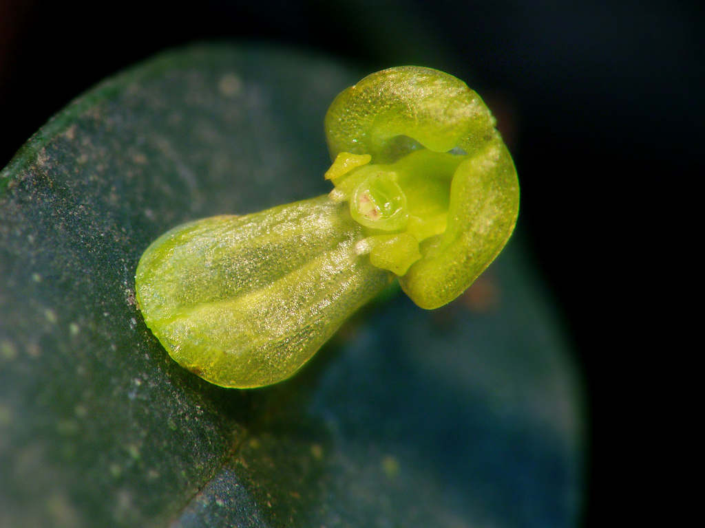 Found in Costa Rica on small roadside fence trees at an elevation of 1500 to 1700 meters in the Arenal Volcano area. It flowered for a few days in August and it has an outward appearance vegetatively of a Lepanthes yet the leaf is more folded [cordate]. Actual flower size is approx 1/4" and occurs on an apical, short, single flowered inflorescence.