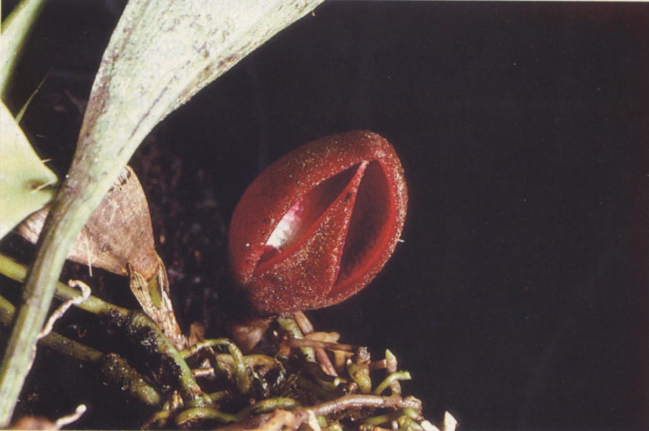 Found in Veraguas department of Panama in montane cloud forests at elevations around 850 to 900 meters as a miniature sized, warm growing epiphyte with stout, ascending ramicauls with 3 loose, imbricating, tubular, often fragmented sheaths and carrying a single, apical, erect, thickly coriaceous, elliptical, subacute, cuneate below into the petiolate base leaf that blooms in the later spring on a pubescent, single flowered inflorescence arising on any of the lower nodes of the ramicaul or rhizome and carrying a single, non-resupinate flower