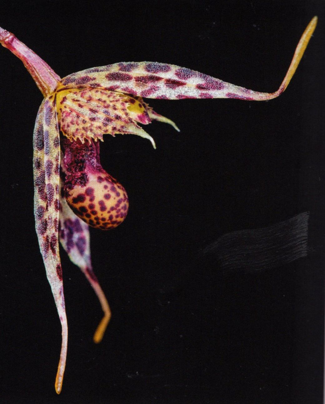 Found in Costa Rica, Panama, Colombia and Ecuador in scrub forests found at elevations of 1650 to 3000 meters as a mini-miniature sized, cool to cold growing epiphyte with slender, erect ramicauls enveloped by 2, thin, tubular sheaths and carrying a single, apical, erect, coriaceous, narrowly obovate, subacute, gradually narrowly cuneate below into the indistinct petiolate base leaf that blooms in the later spring and summer on an erect, loose, slender, 3.2 to 3.6" [8 to 9 cm] long peduncle, to 4 to 9.2" [10 to 23 cm] long overall, flexuous, flexible, gradually lengthening, successively single flowered inflorescence arising laterally from the ramicaul and holding the flower well above the leaves.