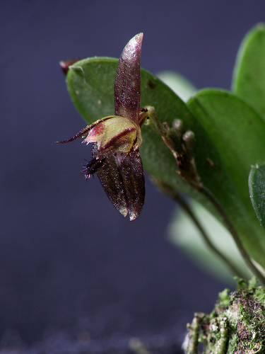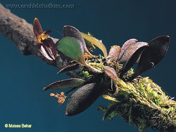 Found in Nayarit?, Oaxaca and Chiapas states of Mexico, Belize, Guatemala, El Salvador, Honduras, Nicaragua, Costa Rica, Panama, Colombia, Ecuador, Peru, Bolivia and Venezuela in rainforests on very thin branches at elevations of 150 to 2000 meters as a miniature sized, hot to cool growing epiphyte with very short ramicauls enveloped basally by 2 close, tubular sheaths and carrying a single, apical, spathulate to obovate, emarginate, coriaceous, obtuse to bidentate apically, gradually conduplicate below into the petiolate base leaf that blooms in the late winter and spring on a basal, thread-like, long-pedunculate, 5/8" [1.5 cm] long, successively single flowered inflorescence