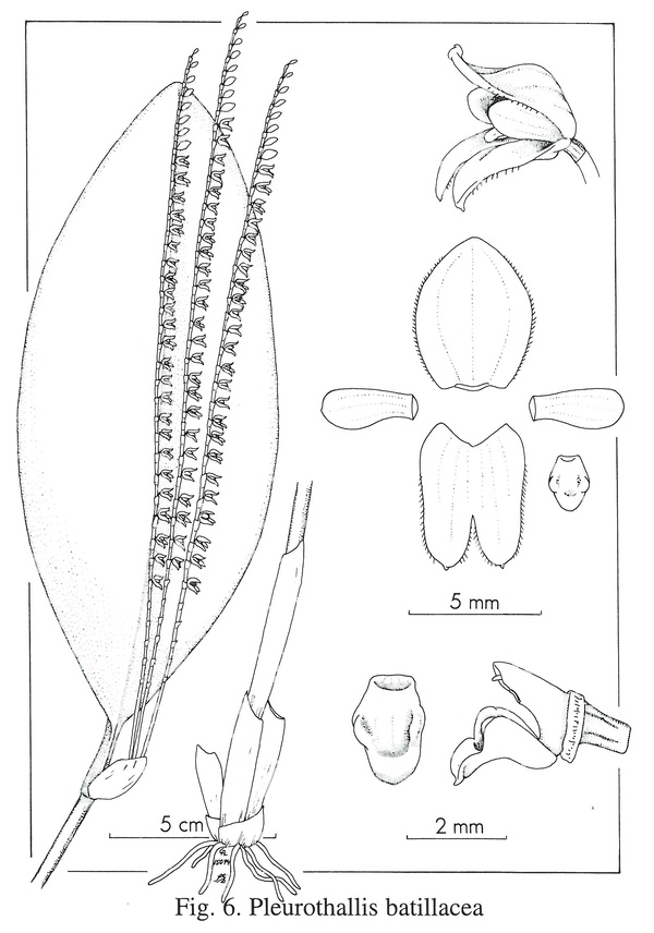 Pleurothallis batillacea Luer 1976 SUBGENUS Crocodeilanthe [Rchb.f & Warsc.]Luer 1986Drawing by © Carl Luer and The Swiss Orchid Foundation at the Jany Renz Herbaria Website