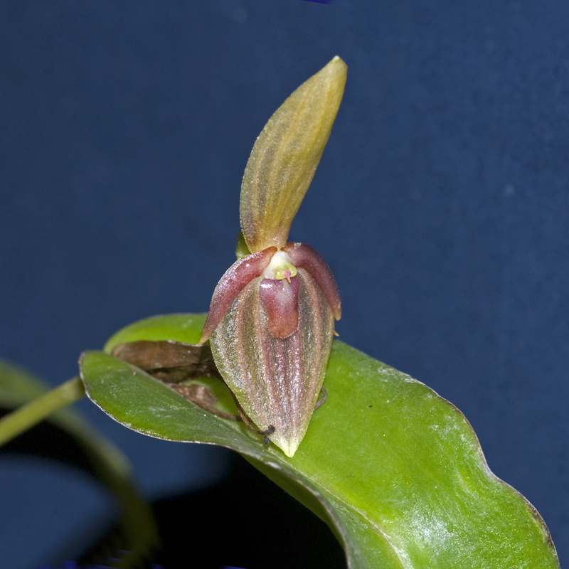 Found in Zamora Chinchipe Ecuador at elevations around 1500 to 1600 meters as a medium sized, cool growing epiphyte with stout, erect, ramicauls enveloped by a close tubular sheath on the lower third and 2 others at the base and carrying a single, apical, coriaceous, suberect, oblong,-ovate, deeply cordate below into the sessile base leaf that blooms in the fall on a short, succession of single flowered inflorescence arising through a spathe and carrying large gaping flowers.