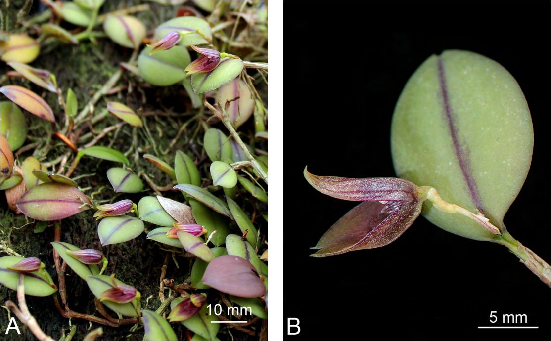 Found in southeastern and southern Brazil at elevations around 600 meters as a mini-miniature sized, warm, repent growing epiphyte with .4" [1 cm] between each ramicaul carrying a single apical leaf that blooms on an eret, single flowered inflorescence
