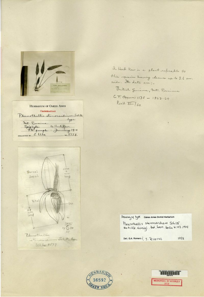 References W3 Tropicos, Kew Monocot list , IPNI ; Bonplandia Rchb.f 1854 as P cardium; Xenia Orchidaceae Vol 3 Reichenbach 1892 as P lansbergii drawing fide; Xenia Orchidaceae Vol 3 Reichenbach 1896 as P cardium drawing fide; Die Orchideen Schlechter 1915 as P cardium; Die Orchideen der Sudamerikanischen Kordillerenstaaten IV Peru Schlechter 1921 as P chanchamayoensis; Die Orchideen der Sudamerikanischen Kordillerenstaaten III Ecuador Schlechter 1921 as P sigsigensis; Beitrage Zur Orchideenkunde Von Colombia 27:52 Schlechter 1924 as P phaeantha; Beitrage Zur Orchideenkunde Von Colombia 27:131 Schlechter 1924 as P pulvinipes; The Orchids of Panama L.O. Williams & P Allen 1946 as P antonensis; Venezuelan Orchids Illustrated Vol 1 Dunsterville & Garay 1959 drawing fide as P monocardia drawing good; Native Orchids of Trinidad Schultes 1960 as Pleurothallis archidiaconi; Venezuelan Orchids Illustrated Vol 2 Dunsterville & Garay 1961 as P linguifera not drawing fide; Encyclopedia of Cultivated Orchids Hawkes 1965 as P cardium; Venezuelan Orchids Illustrated Vol 4 Dunsterville & Garay 1966 as P archidiaconi not = P phyllocardioides; Venezuelan Orchids Illustrated Vol 4 Dunsterville & Garay 1966 drawing fide; AOS Bulletin Vol 36 #9 1967 as P archideaconi; ; AOS Bulletin Vol 36 #9 1967; AOS Bulletin Vol 36 #9 1967 as P cardium; Flora de Venezuela Foldats Volumen XV Part 2 1970 as P archidiaconi drawing good; Flora de Venezuela Foldats Volumen XV Part 2 1970 drawing ok; Flora de Venezuela Foldats Volumen XV Part 2 1970 as P breviscapa drawing ok; Flora de Venezuela Foldats Volumen XV Part 2 1970 as Pleurothallis cardiantha drawing good; Flora de Venezuela Foldats Volumen XV Part 2 1970 as Pleurothallis cardium drawing ok; Flora de Venezuela Foldats Volumen XV Part 2 1970 as Pleurothallis stenocardium drawing good; Die Orchideen 3 Auflage Bd 1 Sonderabdruck aus Schlechter Lieferung 7 385 - 448 Brieger, Maatsch and Senghas 1975 photo hmm; Die Orchideen 3 Auflage Bd 1 Sonderabdruck aus Schlechter Lieferung 7 385 - 448 Brieger, Maatsch and Senghas 1975 as P ignivomii drawing hmm; Venezuelan Orchids Illustrated Vol 6 Dunsterville & Garay 1976 as P lansbergii; Orchids of Venezuela, An Illustrated Field Guide Vol 3 Dunsterville & Garay 1979 as P archidiaconi not = P phyllocardioides; Orchids of Venezuela, An Illustrated Field Guide Vol 3 Dunsterville & Garay 1979 drawing fide; Orchids of Venezuela, An Illustrated Field Guide Vol 3 Dunsterville & Garay 1979 as P cardiantha not = P undulata; Orchids of Venezuela, An Illustrated Field Guide Vol 3 Dunsterville & Garay 1979 as P lansbergii drawing fide; Icones Planetarum Tropicarum plate 235 Dodson 1980 as Pleurothallis ignivomi drawing fide; Icones Pleurothallidinarum Systematics of Pleurothallis Vol 3 Luer 1986; Icones Pleurothallidinarum Systematics of Pleurothallis Vol 3 Luer 1986 as P iognivomi; Icones Pleurothallidinarum Systematics of Pleurothallis Vol 3 Luer 1986 as P pulvinipes; Native Orchids of the Eastern Carribean Kenny 1988 as P archidiaconi photo fide; Icones Orchidacearum I Plate 87 Hagsater & Salazar 1990 as P antonensis drawing ok;The Manual Of Cultivated Orchid Species Bechtel, Cribb & Launert 1992 photo fide; Venezuela, Paraiso de Orquideas Romero 1997 as P cardiantha photo good; Native Colombian Orchids Vol 6 COS 1998 photo ok; Orchids of Venezuela [An illustrated field guide] Vol. 3 Ramiro and Carnevali 2000 drawings fide; Orchids of Bolivia Vol 1 Pleurothallidinae Vasquez & Ibisch 2000 as P ignivomi drawing fide; Orquideolgia Vol 22 #3 2003 sa P lilianae drawing fide; Native Ecuadorian Orchids Vol 4 Dodson 2003 drawing fide; Orquideas Nativas del Tachira Cesar Fernandez 2003 photo not; Manual de Plantas de Costa Rica Vol 3 Hammel, Grayum, Herrera and Zamora 2003 as P angusta; Manual de Plantas de Costa Rica Vol 3 Hammel, Grayum, Herrera and Zamora 2003 as P cardiantha; Flora of the Venezuelan Guayana Vol 7 Steyermark, Berry, Yatskievych and Holst 2003 as P stenocardium; Icones Pleurothallidinarum XXVII Systematics of Dryadella and Acronia Section Macrophyllae-Fasciculatae Luer 2005 as Acronia bivalvis; Orchids of Mexico Hagsater, Soto, Salazar, Jimenez Lopez & Dressler 2005 as P antonensis; Orchid Species of Peru Zelenko & Bermudez 2009 photo fide; Orchids of Costa Rica Vol 5 Morales 2009 as P angusta photo fide; Orchids of Costa Rica Vol 5 Morales 2009 as P cardiantha photo fide; Mille et Une Mini Orchideees Roguenant 2009 photo good; An Illustrated Field Guide to the Orchids of the Yotoco Forest Reserve Colombia Kolanowska, Escobar, Sanchez & Szlachetko 2011 as Zosterophyllanthes bivalvis drawing hmm; Orquideas del Valle de Aburra Medellin Colombia Orqidelogia 2014 photo fide; Guia de Orquideas de Chiapas Carlos Rommel Beutelspacher Baigts 2013 as P antonensis photo good; LANKESTERIANA 19(2).125 - 193 Ossenbach & Jenny 2019 as P stenocardium drawing fide;