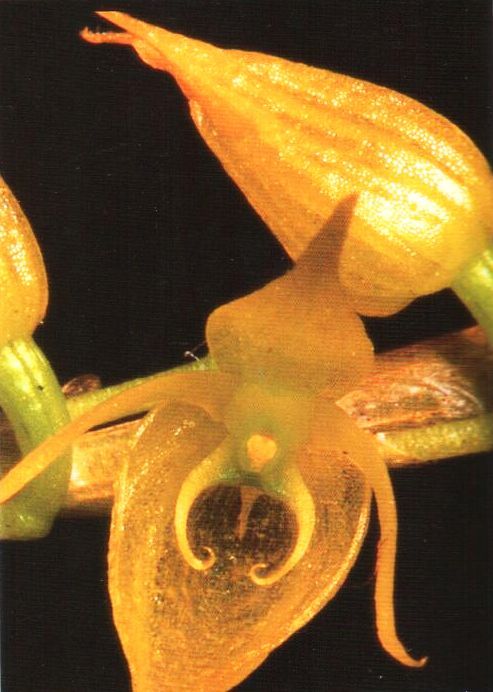 Found in Ecuador on the eastern slopes of the Andes at elevations of 1500 to 2200 meters as a small sized, cool to cold growing epiphyte or terrestrial on road banks with slender, ascending to erect ramicauls enveloped by a tubular sheath above the middle, another below the middle and one other at the base carrying a single, apical, erect, coricaceous, narrowly elliptical, acute, narrowly cuneate below into the sessile base leaf that blooms in the fall on 1 to 12, erecet, arching, subcongested, subsecund, 4 to 6" [10 to 15 cm] long, including the .8 to 1.2" [2 to 3 cm] long peduncle, simultaneously many flowered racemose inflorescence arising through a spathe at the base of the leaf and has oblique, acute floral bracts.