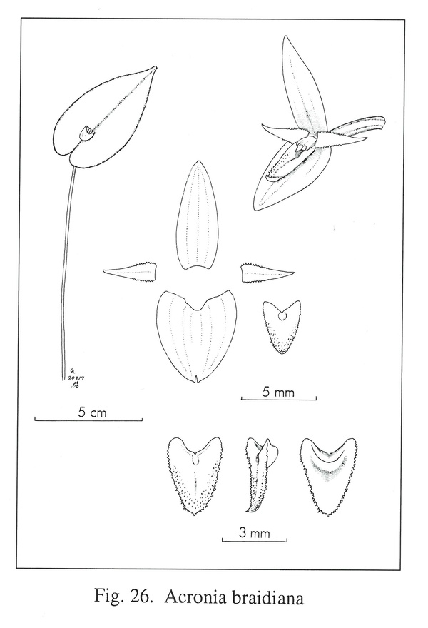 References W3 Tropicos, Kew Monocot list , IPNI ; *Icones Pleurothallidinarum Vol XXVII Luer 2005 as Acronia braidiana drawing fide; AOS Bulletin Vol 76 No 9 2007 photo fide;
