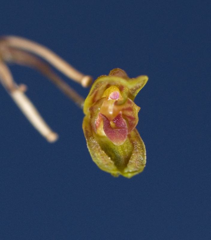 Found in Western Panama without collection data as a mini-miniature sized epiphyte with erect, slender ramicauls carrying a single, apical, elliptical, obtuse, cuneate below to the petiolate base leaf that blooms in the fall on an erect, slender, .8 to 1" [2 to 2.5 cm] long, congested, fascile of successive single flowered inflorescence with thin, tubular, imbricating, acuminate floral bracts.