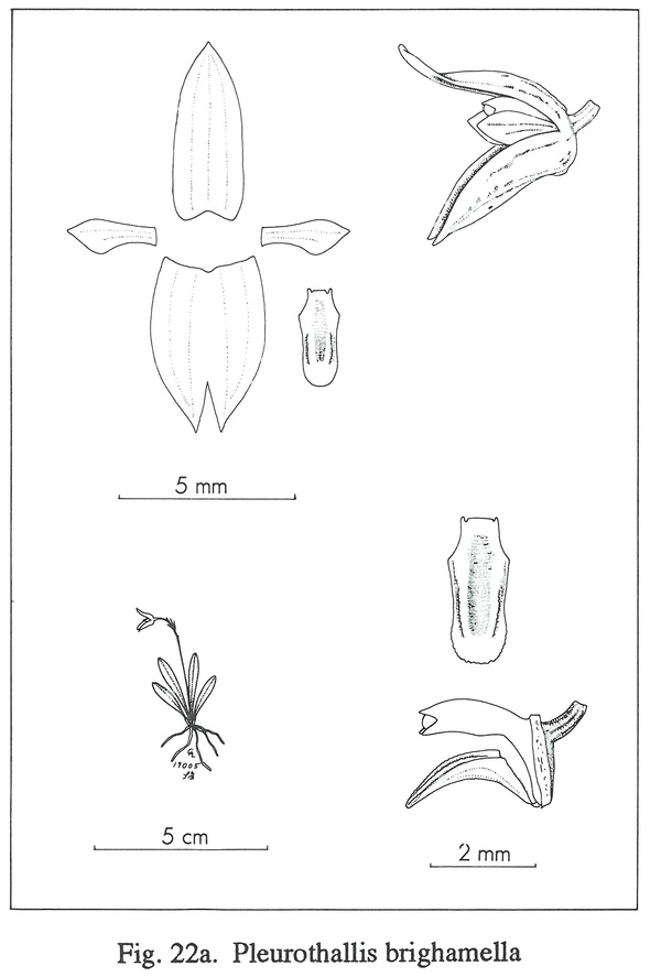 References W3 Tropicos, Kew Monocot list , IPNI ; *Icones Pleurothallidinarum Vol XVIII Systematics of Pleurothallis subsection Antenniferae, Longiracemosae, Macrophyllae-Racemosae and Subgenera Pseudsostelis and Acuminata Luer 1999 drawing fide;Orquideologia Vol 21 #3 2000 drawing fide; Lindleyana Vol 16 No 4 2001 as Specklina brighamella; Icones Pleurothallidinarum Vol XXVIII Luer 2006 as Sarcinula brighamella drawing fide
