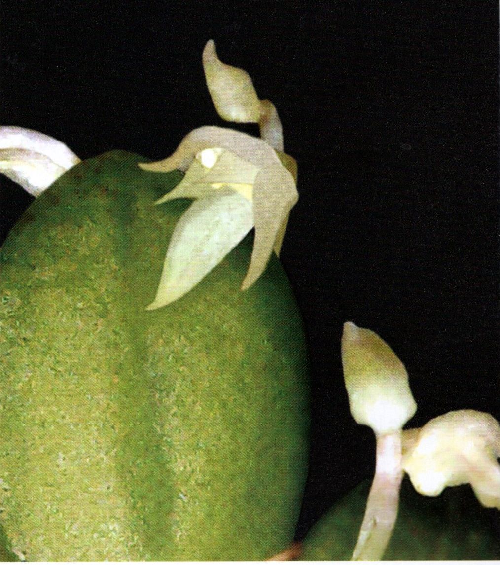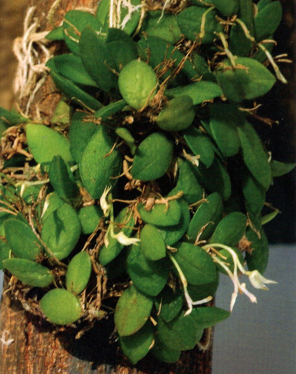 Found in Minas Gerais state of Brazil in riparian forests at elevations around 800 meters as a mini-miniature sized, warm growing repent epiphyte with a mat forming, inconspicuous rhizome giving rise to short, cylindrical ramicauls carrying a single, apical, fleshy, leathery, elliptic-obovate, variable in size abruptly narrowing below into the base leaves that blooms in the spring on a somewhat pendent, shorter than the leaf, arising through a short, acute sheath, successively single, 2 flowered inflorescence.