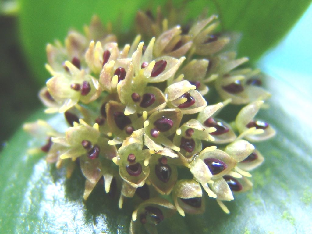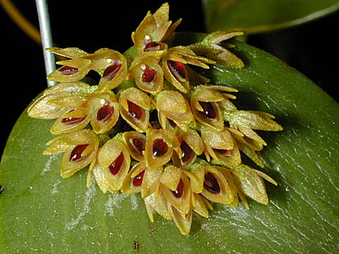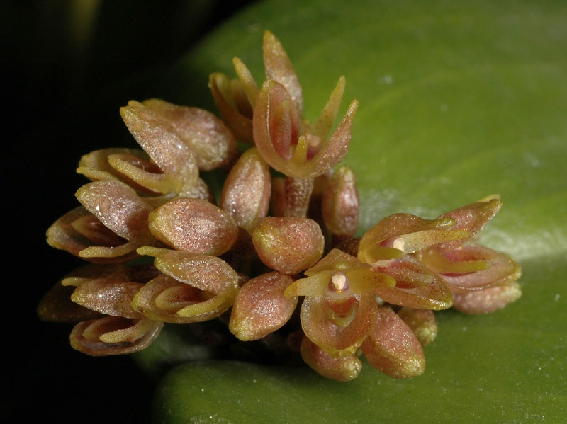 Characterized by the small to medium sized habit and a dense fascile of small flowers, often old and in bud, arsiing from the base of a thickly coriaceous, more or less horizontal, cordate leaf as well as the sepals and petals are fleshy and externally verrucose and the concave synsepal is filled with a fleshy, ovate, concave, cellular-papillose lip.