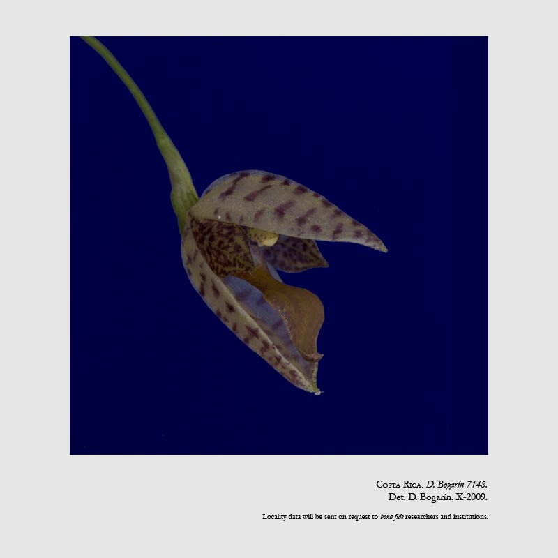 Found in Costa Rica and Panama at elevations around 750 to 1800 meters as a small sized, warm to cool growing epiphyte with slender, erect to reclining ramicauls enveloped by a loose, tubular sheath below the middle and 2 others at the base and carrying a single, apical, erect to suberect to spreading, thinly coriaceous, ovate, acute, narrowly cuneate below into the sessile base leaf that blooms at most any time of the year on an arching to reclining, slender, congested, 1.2" to 2" [3 to 5 cm] long, successively few flowered inflorescence arising from a spathe with infundibular floral bracts.