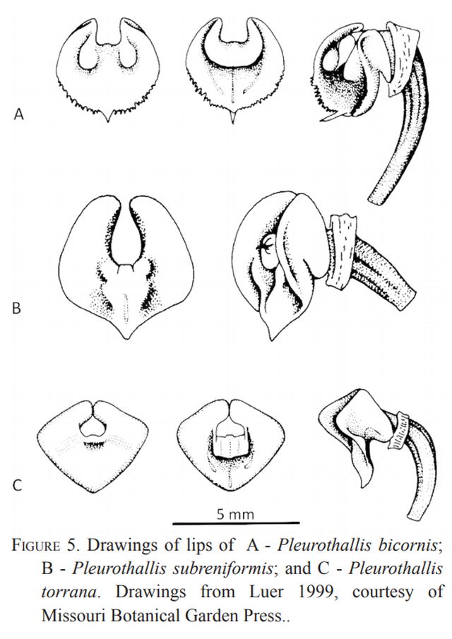 "Pleurothallis caucensis can be distinguished from P. bicornis by the petals, which in P. caucensis are free, projected laterally and downward and in P. bicornis are adpressed and project forwards; by the lip which is completely fimbriated in P. caucensis and only fimbriated on the margin of the central lobe in P. bicornis; and by the lateral lobes of the lip which are flattened and surpass the column in P. caucensis and which are auriculate, not surpassing the column in P. bicornis. Pleurothallis caucensis differs from P. subreniformis in the length of the raceme, sepals and petals, which are longer in P. caucensis than in P. subreniformis; and in the lip shape, which is suborbicular in P. caucensis and hippocrepiform with an acute apex on the midlobe in P. subreniformis. Pleurothallis caucensis differs from P. torrana in the length of the ramicauls, raceme, sepals and petals, all of which are longer in P. caucensis than in P. torrana in the lip shape which is suborbicular in P. caucensis and rhombiform in P. torrana; and in the lip callus, which consists of a pair of lunate calli in P. caucensis and a single transverse callus in P. torrana." Wilson etal 2017