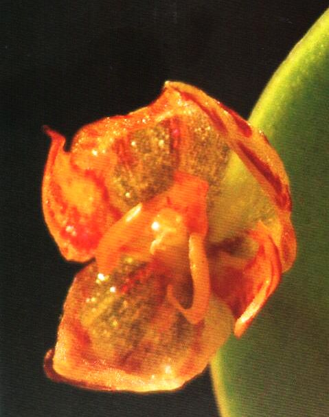 Found in Narino Colombia and Carchi Ecuador at elevations around 1000 to 1300 meters as a mini-miniature sized, cool growing epiphyte with slender, erect ramicauls enveloped by a close tubular sheath above the base and carrying a single, apical, erect, coriaeceous, ovate, acute, cuneate below intothe sessile base leaf that blooms in the late summer and early fall on a fascile of successively single, few flowered inflorescence arising through a prostrate spathe and has a .12 to .2" [3 to 5 mm] long peduncle.