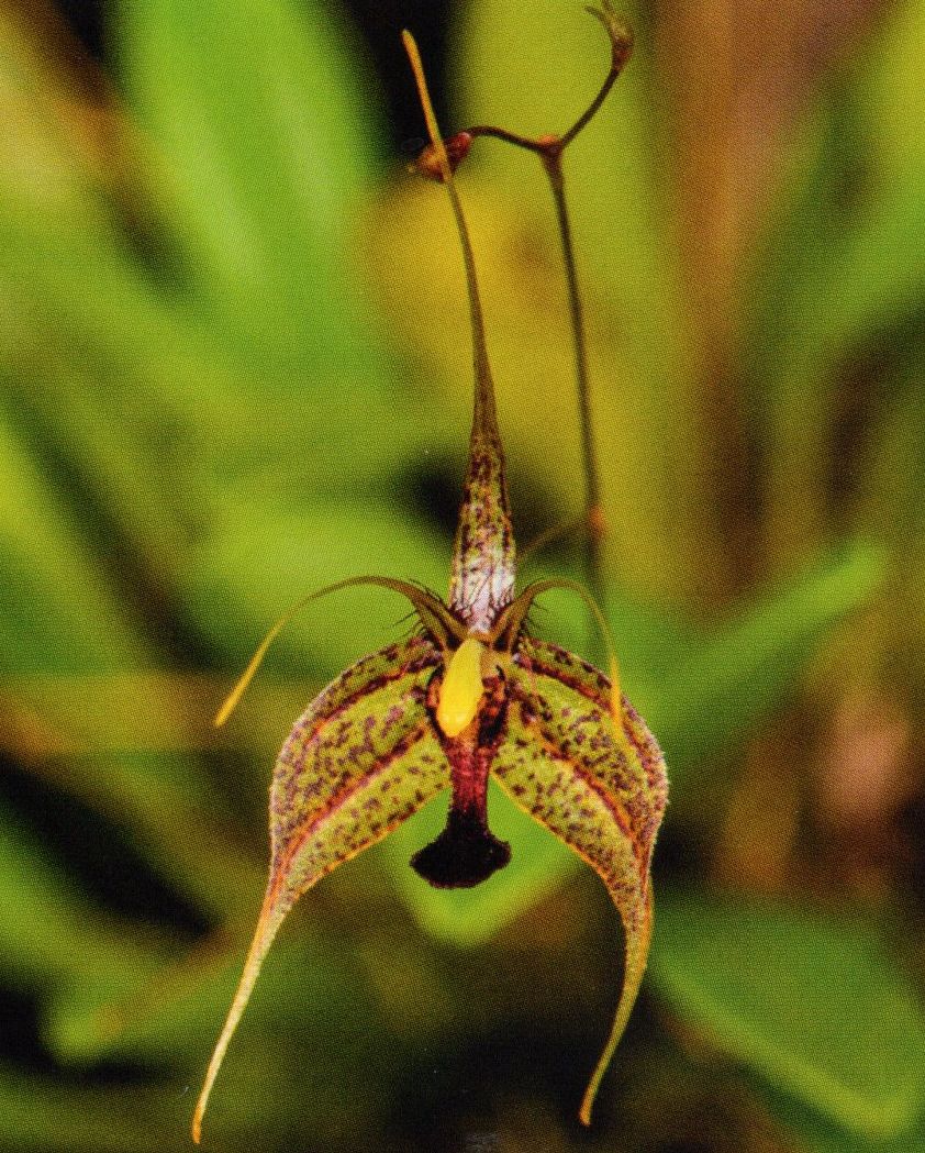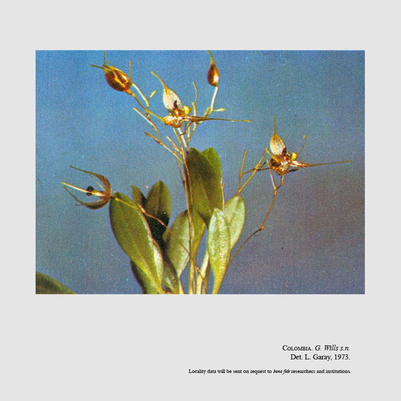 Found in Colombia and Ecuador at elevations of 1500 to 2500 meters as a mini-miniature sized, cool to cold growing epiphyte with slender, erect ramicauls enveloped by 2 thin, tubular sheaths and carrying a single, apical, eret, coriaceous, elliptical, subacute to obtuse, cuneate below intot he petiolate base leaf that blooms in the fall and early winter on an erect, flexible, flexuous, loose, filiform, to 2.4” [6 cm] long including the .8 to 1.2” [2 to 3 cm] long peduncle, successively single, several flowered inflorescence arising laterally from the ramicaul.