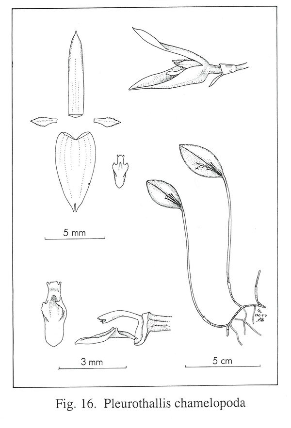 Pleurothallis chamelopoda Luer 1996 SUBGENUS Acianthera SECTION Sicariae SUBSECTION Sicariae Luer 1986 Drawing by Carl Luer and The Swiss Orchid Foundation at the Jany Renz Herbaria Website