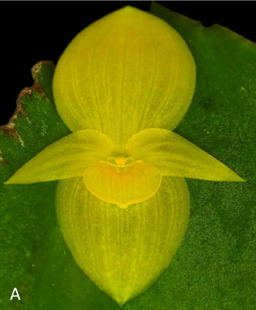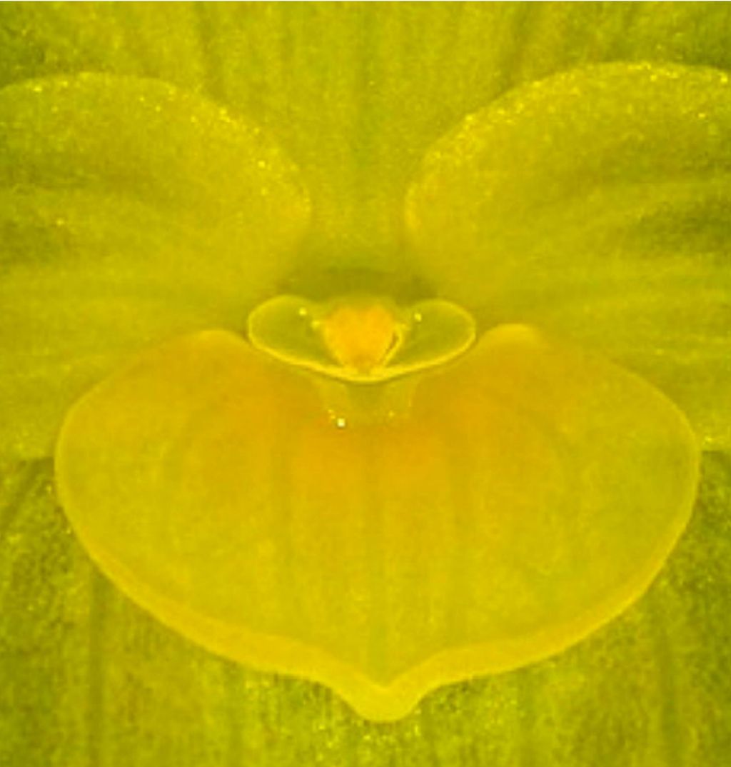 Found in Carchi province of Ecuador at elevation around 1590 meters as a small to medium sized, cold growing epiphyte with green, erect, slender, ramicauls enclosed by a tubular, brown sheath running through the second third from the base, and 1 to 2 other tubular sheaths near the base and carrying a single, apical, green above, microscopically papillate, dull, light green underneath, perpendicular to the ramicaul, coriaceous, ovate, acuminate, edge entire, the base sessile, deeply cordate, with lobes connate for .4" [1 cm] leaf that blooms in the late fall with a solitary resupinate, flower, produced successively from a reclining spathaceous bract ca. .4" [1 cm] long; peduncle ca. .12 to .2" [3 to 5 mm] long concealed within the spathe with much shorter than the pedicel floral bracts.