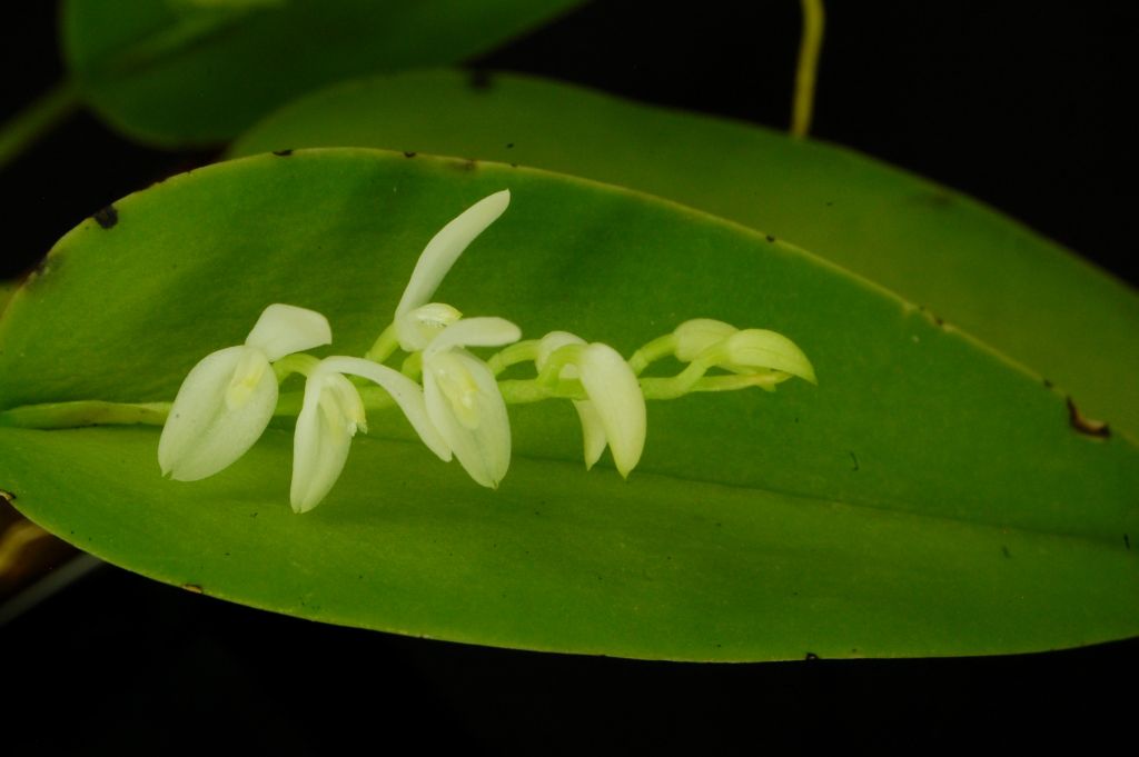 Found in Santander Colombia and Napo Ecuador in cloud forests at elevations of 1650 to 1700 meters as a mini-miniature to miniature sized, cool growing epiphyte with erect, slender, slightly compressed towards the apex ramicauls with 2 to 3, tubular sheaths about the base and carrying a single, apical, coriaceous, suberect, ovate, acute, rounded below into the sessile base leaf that blooms in the spring on a congested, distichous, .8" [2 cm] long, including the .4" [1 cm] long, peduncle, simultaneously 6 to 8 flowered inflorecence arising through a spathe at the base of the sessile leaf.