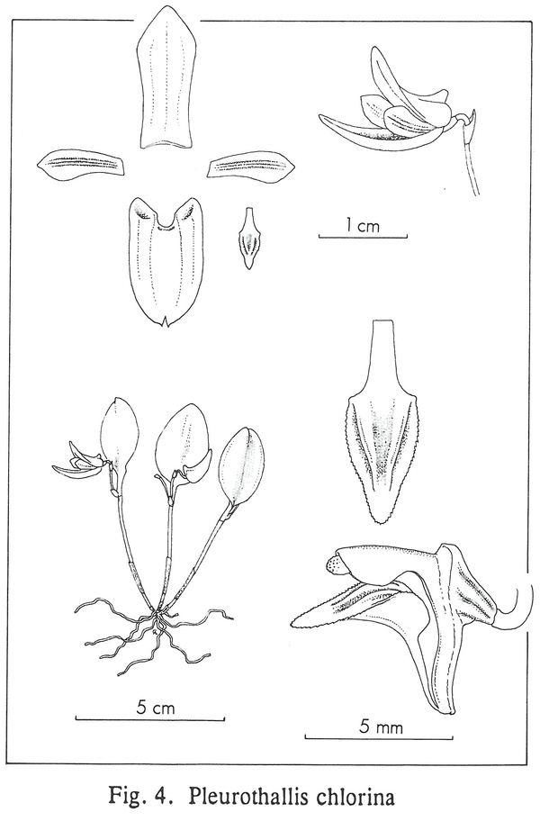 Pleurothallis chlorina Luer 1980 SUBGENUS Specklinia SECTION Effusae Lindl. 1842Drawing by Carl Luer and The Swiss Orchid Foundation at the Jany Renz Herbaria Website
