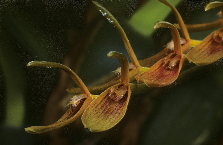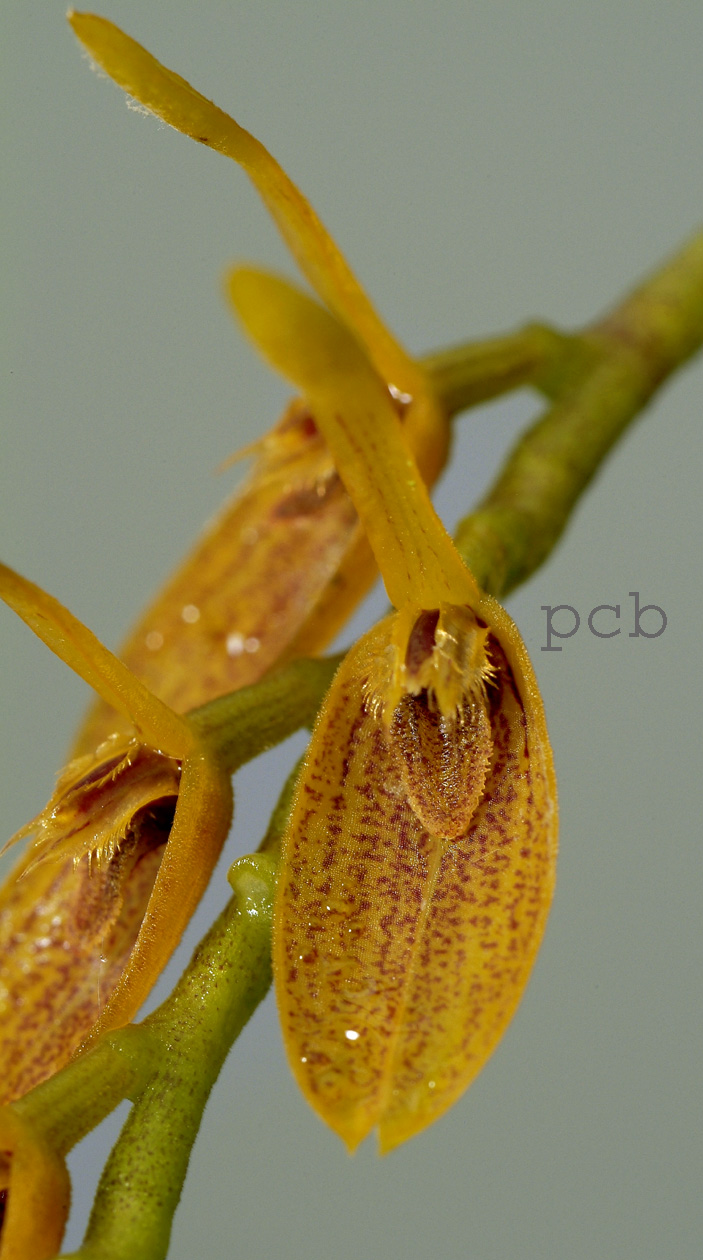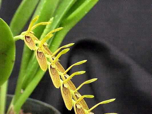 Found in Colombia, Ecuador, Peru and northern Brazil as a small sized, hot to warm growing epiphyte with an erect ramicaul enveloped basally by 2 to 3 tubular sheaths and carrying a single, apical, erect, coriaceous, elliptic-lanceolate to oblong, emarginate apically, basally cuneate leaf that blooms in the winter on a nodding, usually solitary, racemose, to 4" [10 cm] long, several flowered inflorescence.