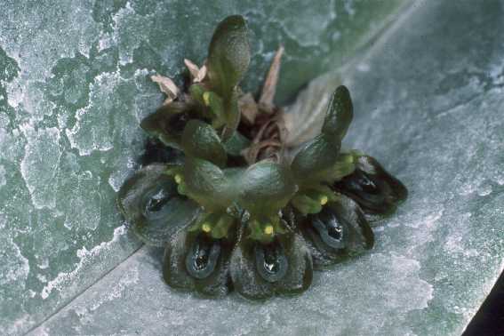 Found from Mexico, Guatemala, El Salvador, Honduras, Nicaragua and Costa Rica in high elevation cloud forests as a small sized, warm to cold growing epiphyte that occurs at altitudes of 2000 to 2200 meters with a triangular, sulcate ramicaul carrying a single, apical, fleshy, elliptical, retuse apically, grey-green leaf that gradually becomes conduplicate into a long sinus and blooms in the spring and summer on a short, fasciculate, to 1" [2.5 cm] long, few flowered inflorescence arising from the midvein below the middle of the leaf and holding the flowers close to the leaf.