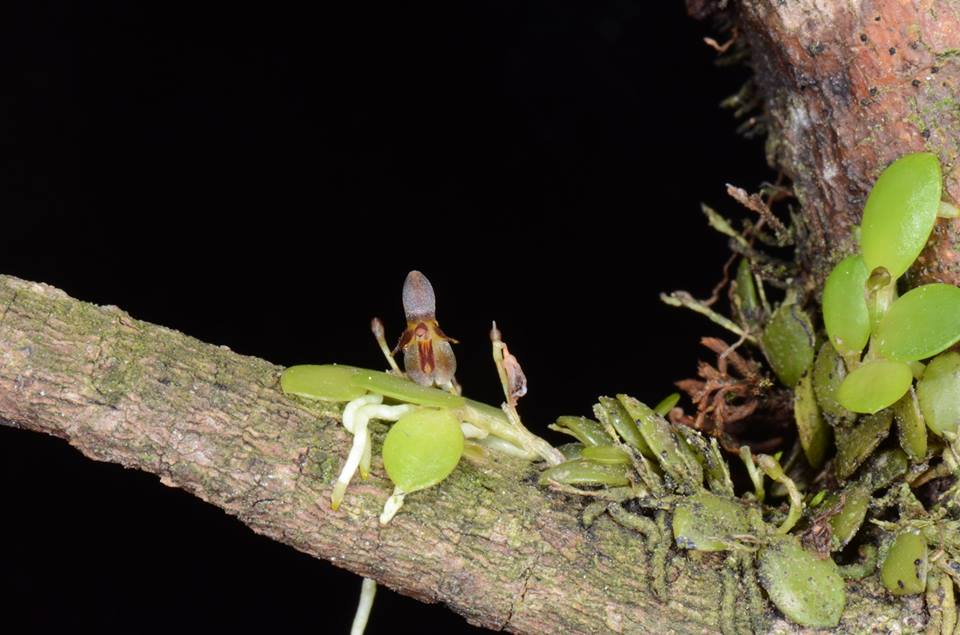 Found in Guatemala and Honduras in cloud forests at elevations around 1300 meters as a mini-miniature sized, cool growing epiphyte with ascending, slender ramicauls with 1 thin, tubular sheath and carrying a single, apical, coriaceous, prostrate, overlapping, broadly elliptical, obtuse, broadly cuneate below into the petiolate base leaf that blooms at most any time of the year on an erect to suberect, congested, slender, .75" [1.8 cm] long including the .08 to .12" [2 to 3 mm] long peduncle, successively single, 2 to 4 flowered inflorescence arising laterally from the ramicaul.