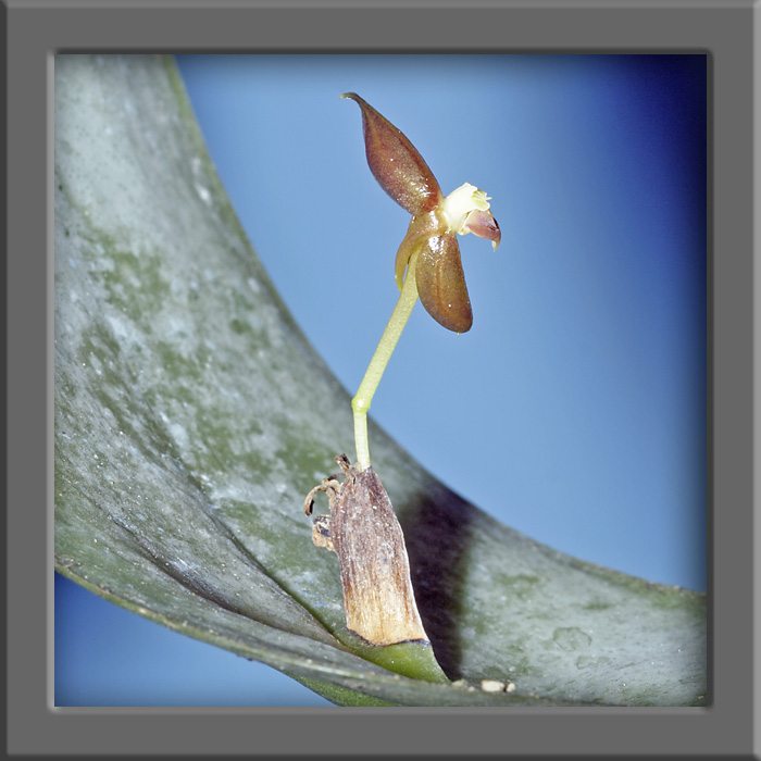 Found in Costa Rica at elevations around 1500 meters as a miniature to small sized, warm growing epiphyte with slender, erect, sharply compressed ramicauls with a sheath in the lower 1/3 and 2 at the base and deccurrent into the deflexed, single, coriaceous, concave, ovate, acuminate to the acute apex, abruptly narrowing below into the shallowly cordate base leaf that blooms in the spring on a fascile of successive single flowers arising through a suberect spathe and tubular floral bracts.