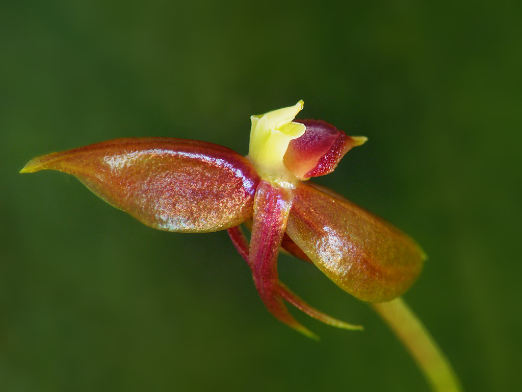 Set apart from others in the section by the sharply compressed ramicauls carrying a deflexed leaf that is decurrent for a least one centimeter somewhat like some species within the section Ancipita. It also has small brown flowers protruding from the spathe and face downward. The sides of the dorsal sepal and synsepal as well as the subfalcate petals are reflexed. Lastly the triangular lip has a pyramidical callus fit beneath the colum withn the glenion and the viscidium in apposition.