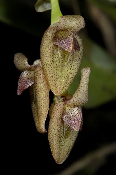 Found in Haiti and the Dominican Republic as a mini-miniature sized, warm to cool growing epiphtye with compressed-alate, erect ascendent ramicauls enveloped by 2 sheaths and carrying a single, apical, fleshy, obovate to elliptic, emarginate, tridenticulate leaf that blooms in the winter on to 3, flexous, distichously to 8 flowered, racemose inflorescence arising through a spathe.