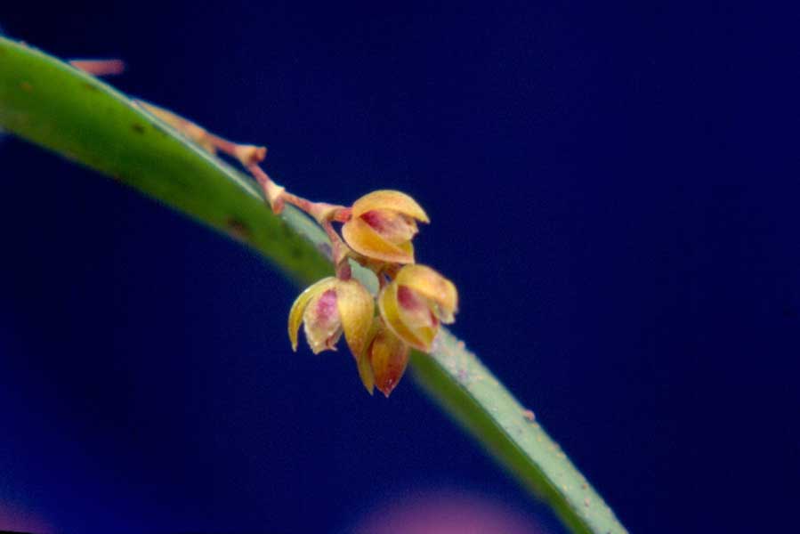 Found in Brazil and Bolivia at elevations of 1200 to 1800 meters as a minature sized, warm to cool growing epiphyte with erect, slender, purple ramicauls enveloped basally by 2 to 3, tubular sheaths and carrying a single, apical, erect, purple, elliptic, obtuse, gradually narrows below into the base leaf and blooms in the late spring through summer on a lateral, purple, 1" [2.5 cm] long, successively several to 12 flowered inflorescence arising through a spathe with long lasting, color variable flowers